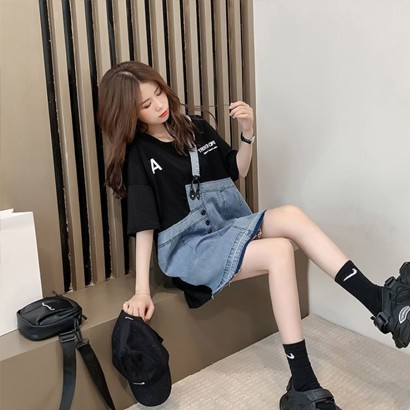 เดรสเสื้อยืดลายเอี๊ยมแบบคล้ายสองชิ้น