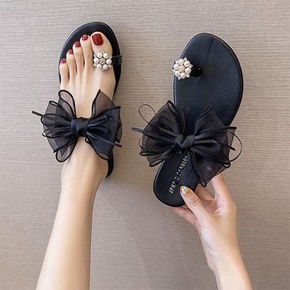 รองเท้าแตะผูกโบว์ แบบสวมนิ้วประดับไข่มุก